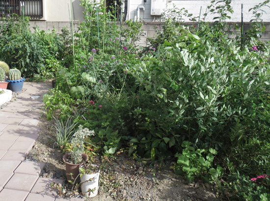 | 2015/7/13(月) ■メガネ新調 自宅で使うメガネの度が合わなくなっているのでJINSに行った。 (最近あまりに物が見えづらいので、緑内障かと思い緑内障チェックサイトでチェックした) 今回、初めてブルーライトをカットするPC用レンズで作ることにした。半信半疑ながら。 乱視が強くてレンズの在庫が無いとのことで、受取は一週間後。 その後、実家に寄った。庭がますます茂っている。